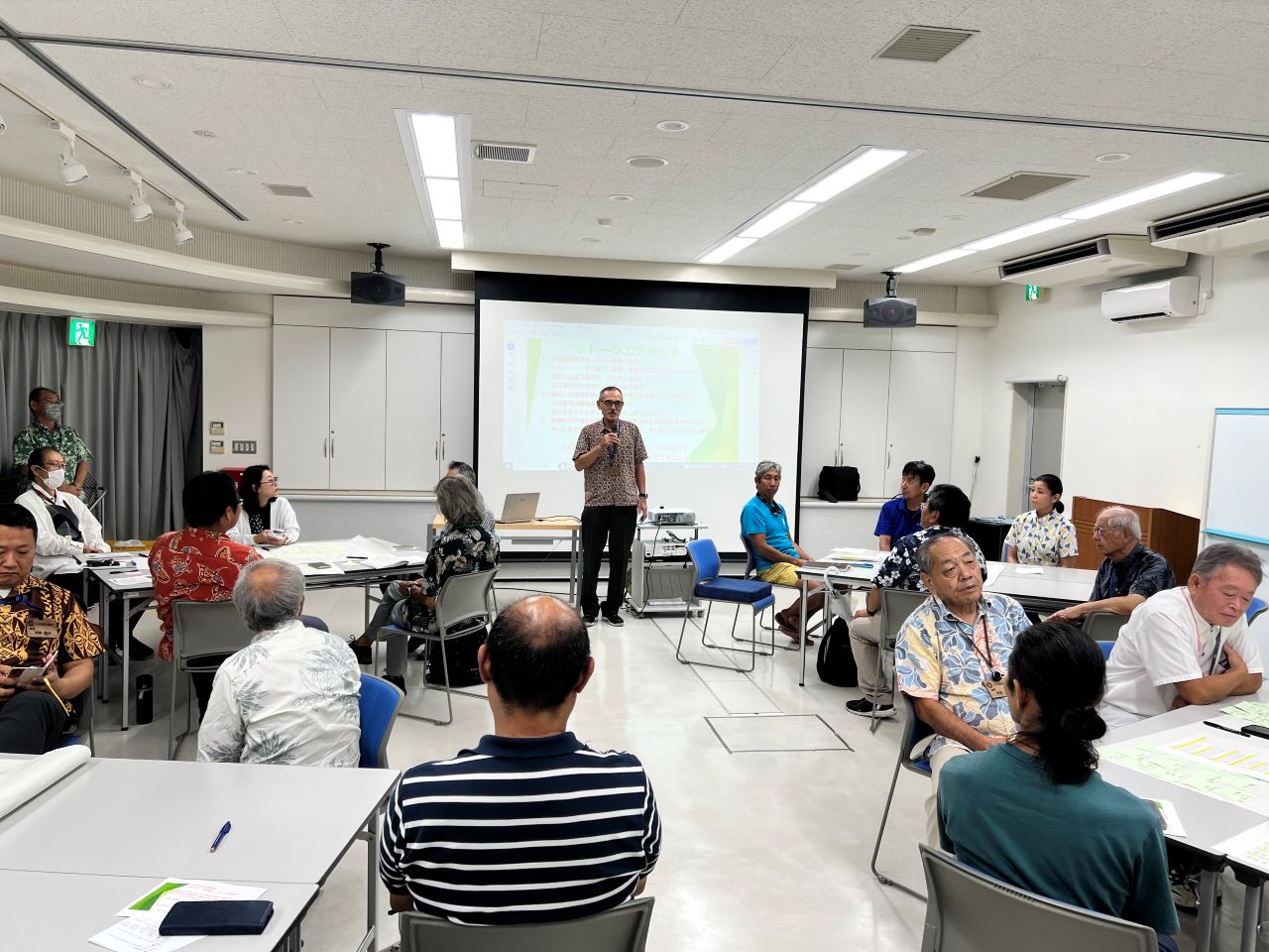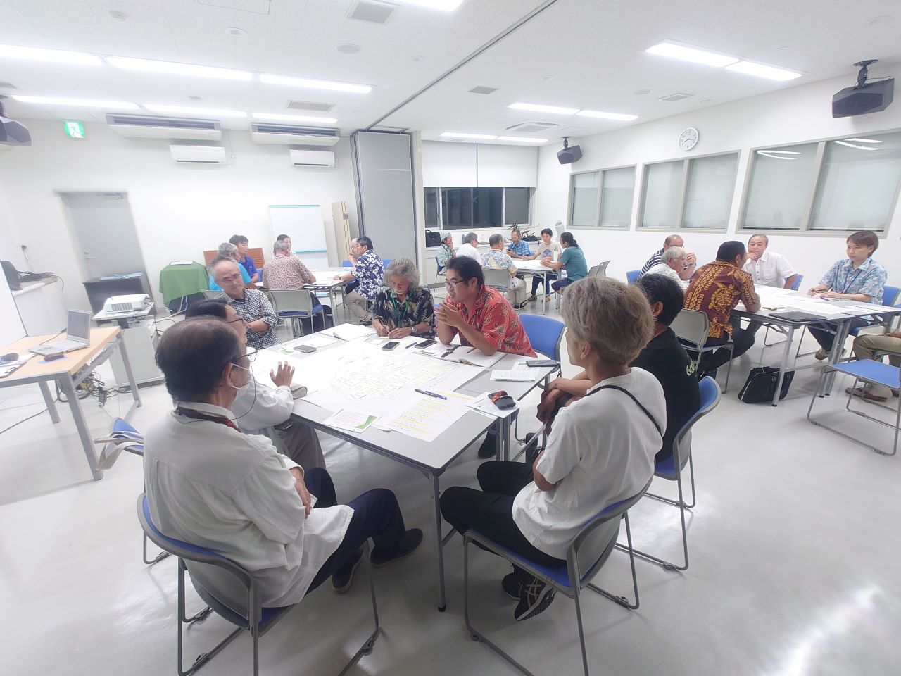 母島、父島の両島で、村民の皆さまと議員全員との懇談会をワールドカフェ方式で開催いたしました。入場時にアンケートを記入していただき、その場で集計、その内容を元に議員2名ずつの4つのテーブルで、15分の意見交換をメンバーチェンジしつつ2回行いました。意見交換の前には自己紹介とアイスブレイクで島の好きな所を挙げてもらい、各テーブル笑顔の見える場となりました。