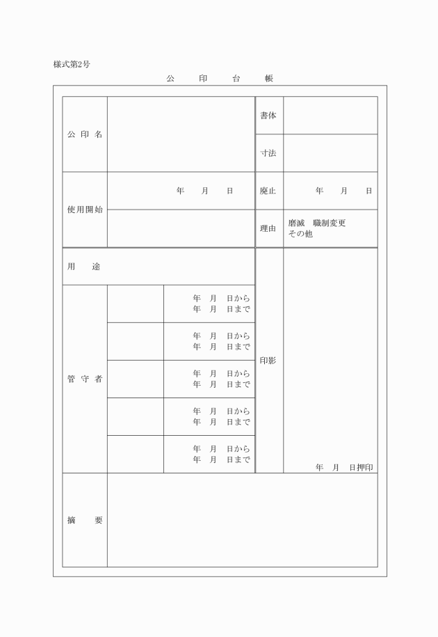 第7条 教育長は、公印台帳(様式第2号)を備え、公印の調製、改刻又は廃棄のつど、公印の種類、印影、その他必要な事項を記載し、整理しておかなければならない。
