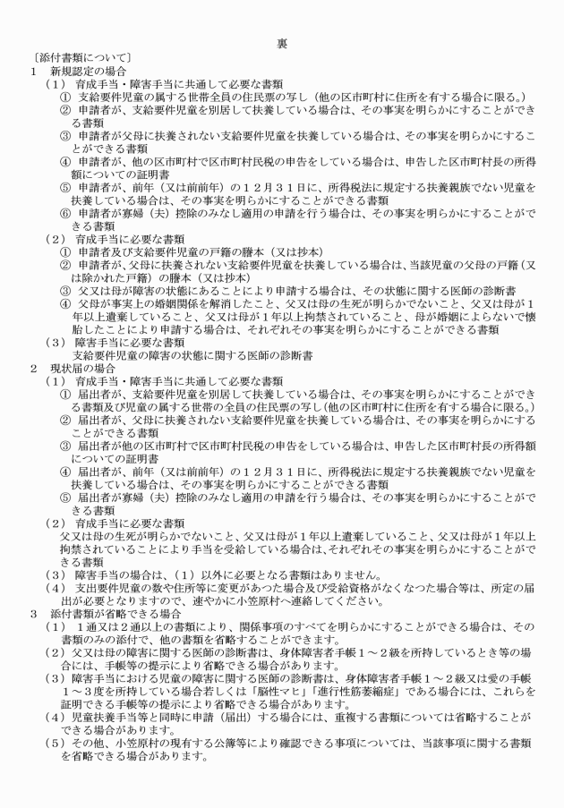 (1) 児童育成手当(以下「手当」という。)の支給要件に該当する者(以下「受給資格者」という。)の扶養(監護し、かつ、その生計を主として維持することをいう。以下同じ。)する条例第4条第1項に規定する支給要件児童(以下「支給要件児童」という。)が小笠原村の区域内に住所を有しないときは、当該支給要件児童の属する世帯の全員の住民票の写し