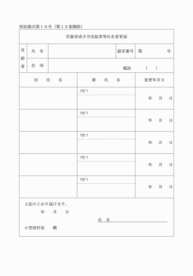 第15条 受給者は、氏名を変更したとき、又は受給者の扶養する支給要件児童のうちに氏名を変更した者があるときは、速やかに児童育成手当受給者等氏名変更届(別記様式第10号)に当該氏名を変更した者の戸籍の抄本を添えて、小笠原村長に提出しなければならない。