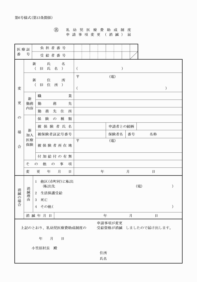 第13条 条例第8条第1項に規定する規則で定める届出は、申請事項変更(消滅)届(第6号様式)に医療証を添えて行わなければならない。