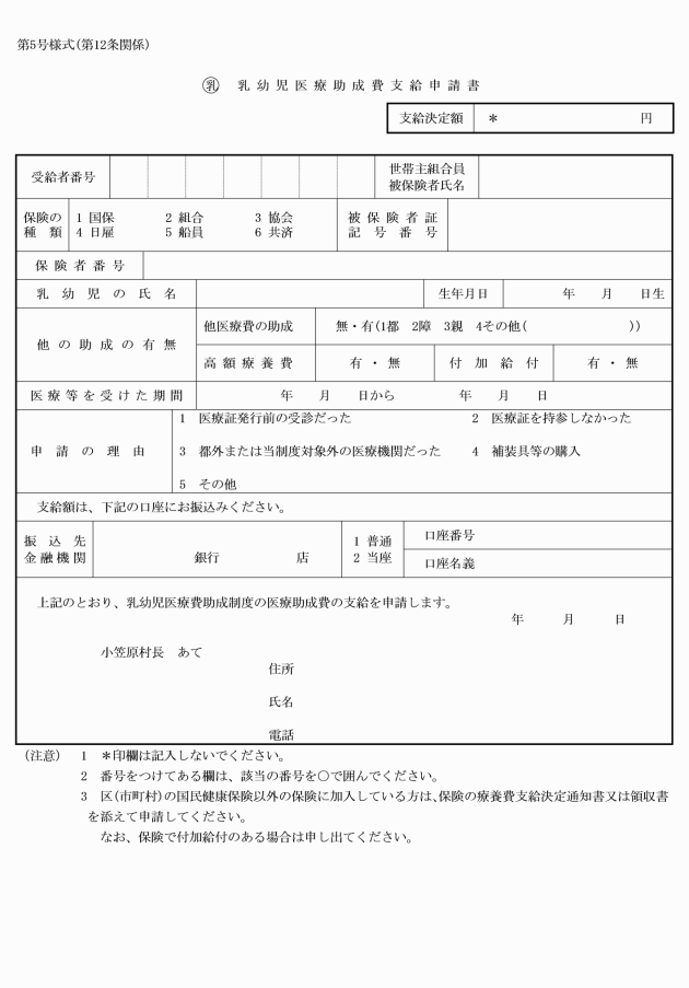 2 条例第7条第2項に規定する方法により医療費の助成を受けようとする対象者は、医療費助成支給申請書(第5号様式)により村長に申請しなければならない。