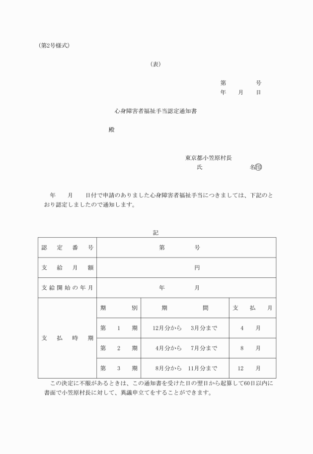 第13条 受給者は毎年6月1日から7月31日までの間に、心身障害者福祉手当受給者現況届書(第7号様式)を村長に提出しなければならない。ただし、村長がその届出を要しないと認めたときはこの限りでない。