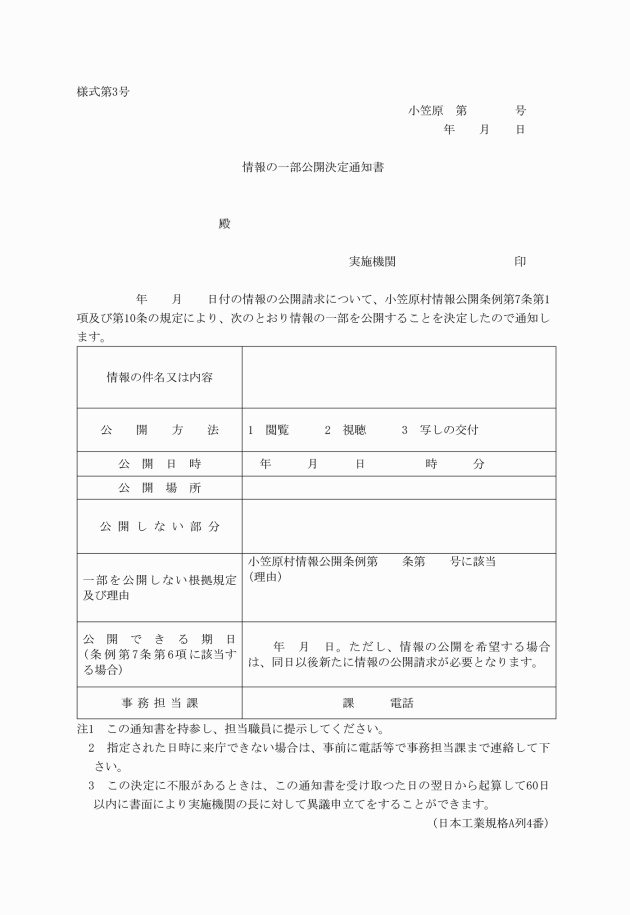 第6条 条例第14条第3項の規定により、小笠原村情報公開審査会に諮問した場合は、審査会諮問通知書(様式第10号)により同条同項各号に掲げるものに通知するものとする。