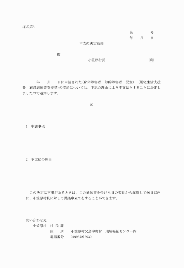 4 村長は、身障法第17条の5第2項、知障法第15条の6第2項若しくは児童法第21条の11第2項の規定による居宅生活支援費の不支給の決定又は身障法第17条の11第2項若しくは知障法第15条の12第2項の規定による施設訓練等支援費の不支給の決定をしたときは、不支給決定通知書(様式第8)により、当該不支給の決定をした身体障害者、知的障害者又は障害児の保護者に通知するものとする。