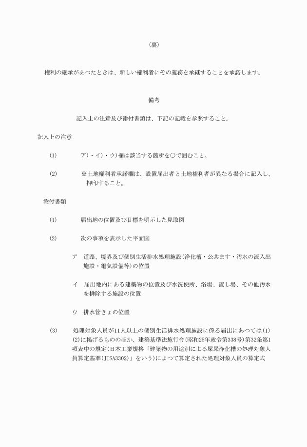 第5条 条例第6条第1項又は第2項の規定により排水設備等の計画の確認を受けようとする者は、排水設備等計画(変更)確認申請書(第4号様式)に次に掲げる書類を添付して、村長に提出しなければならない。ただし、土地又は建築物の状況により数人共同して設置するときは、代表者を定め、代表者が申請しなければならない。
