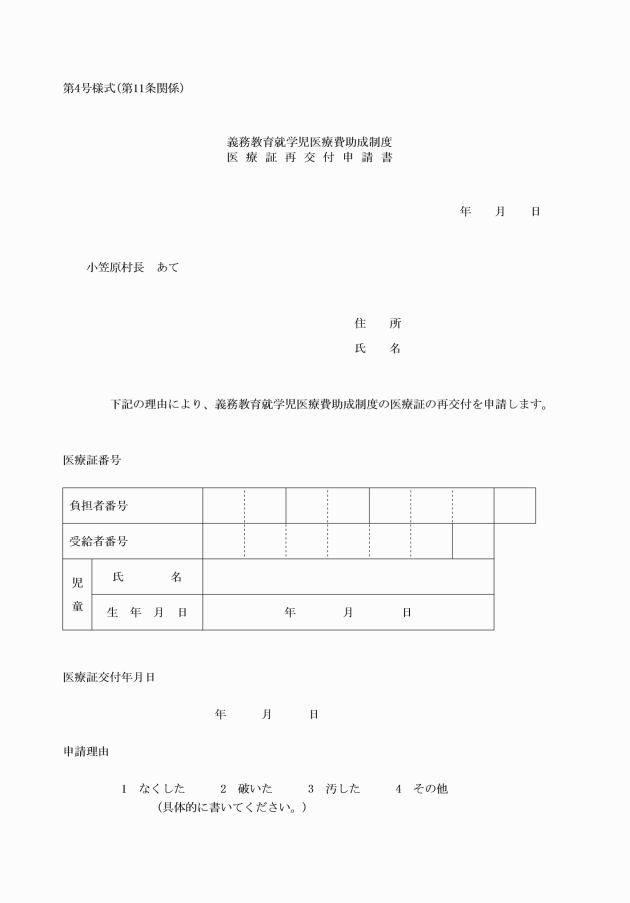 第11条 対象者は、医療証を破り、汚し、又は失つたときは、医療証再交付申請書(第4号様式)により村長に医療証の再交付を申請することができる。