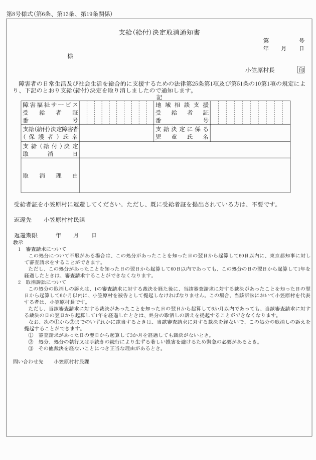 第6条 省令第20条第1項及び第34条の6第2項に規定する支給決定の取消しの通知は、支給決定取消通知書(第8号様式)によるものとする。