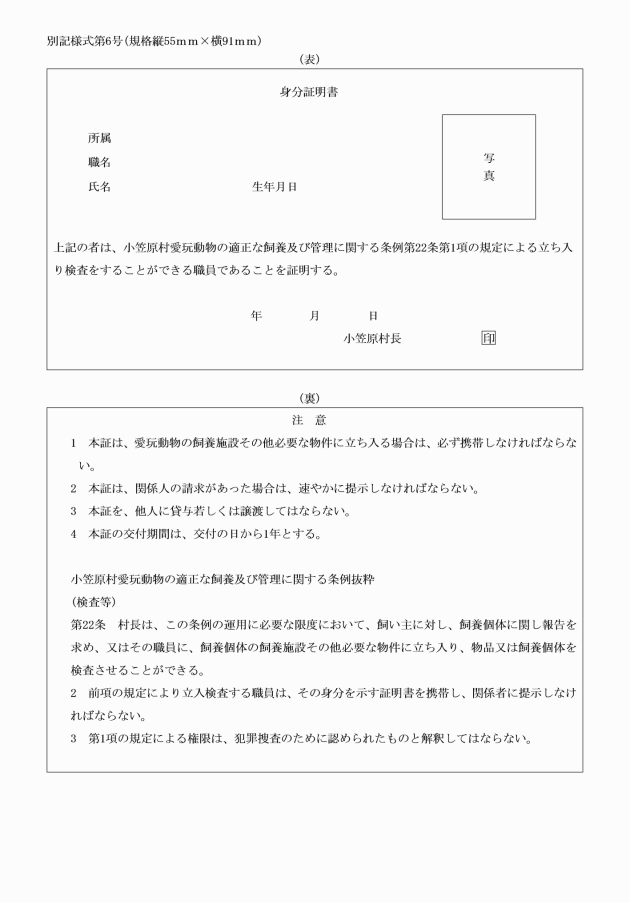 第4条 条例第22条第2項の規定による職員の身分を示す証明書は、身分証明書(別記様式第6号)とする。