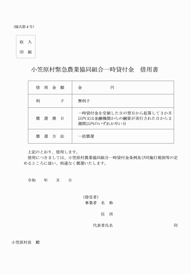 2 前項の借用書の提出にあたっては、借用金額に応じた金額の印紙を貼付し、その費用は農協の負担とする。